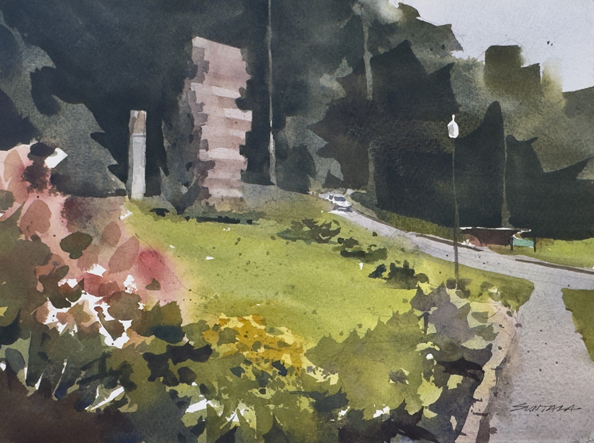 Loose plein air watercolor of the Armenian Cultural Garden.