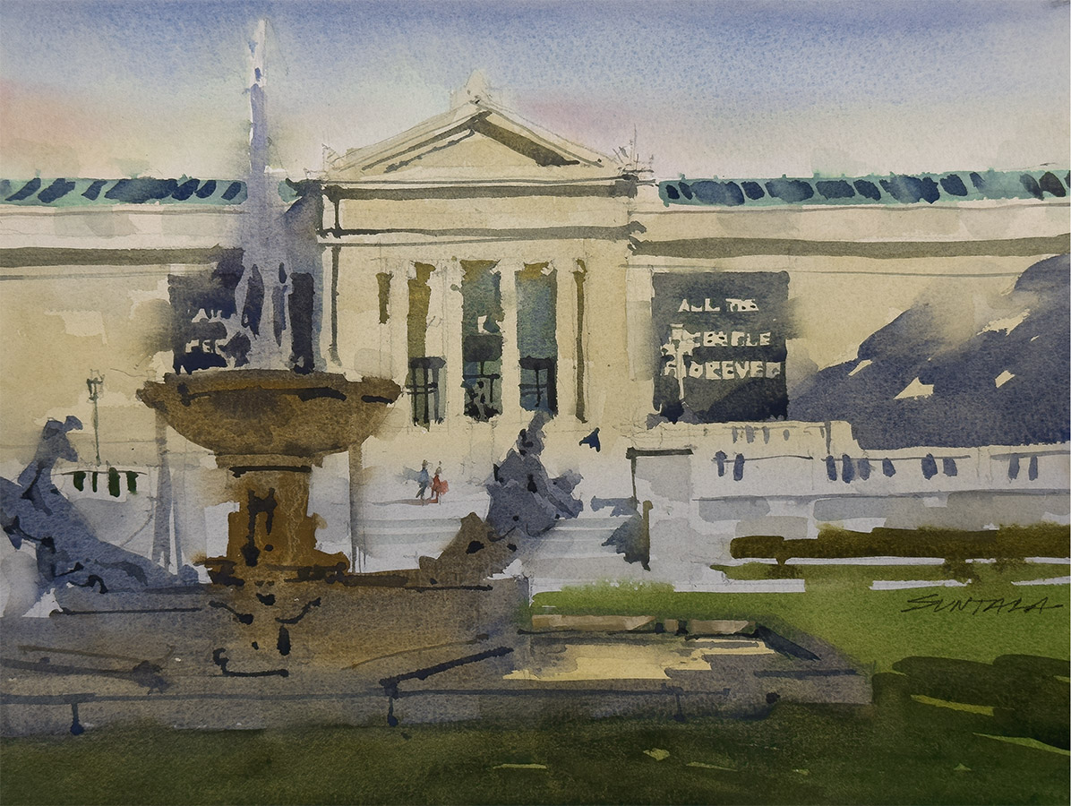 Loose plein air watercolor of the Cleveland Museum of Art and the fountain in front of it.