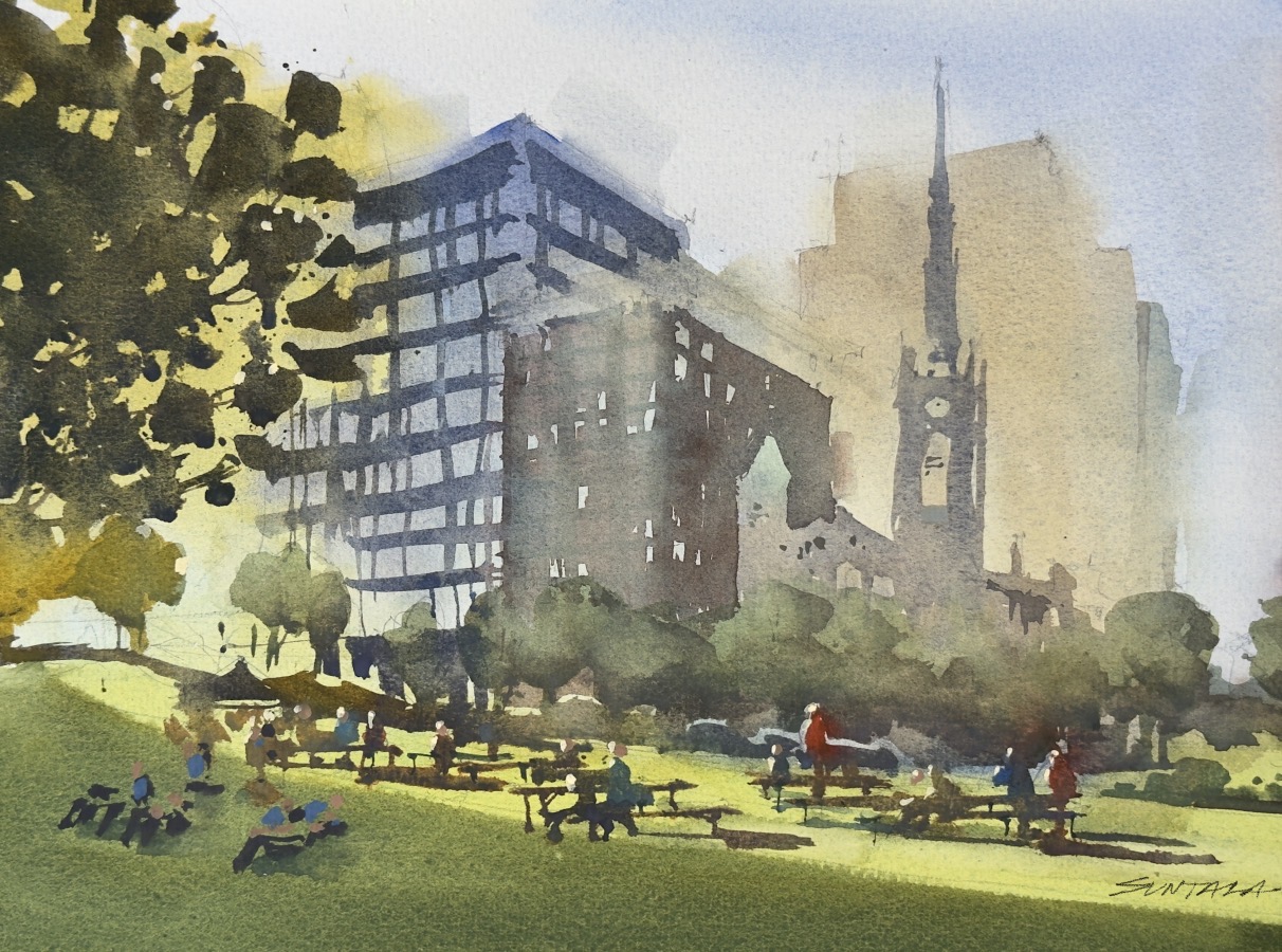 Loose plein air watercolor of Public Square looking north at the Old Stone Church.