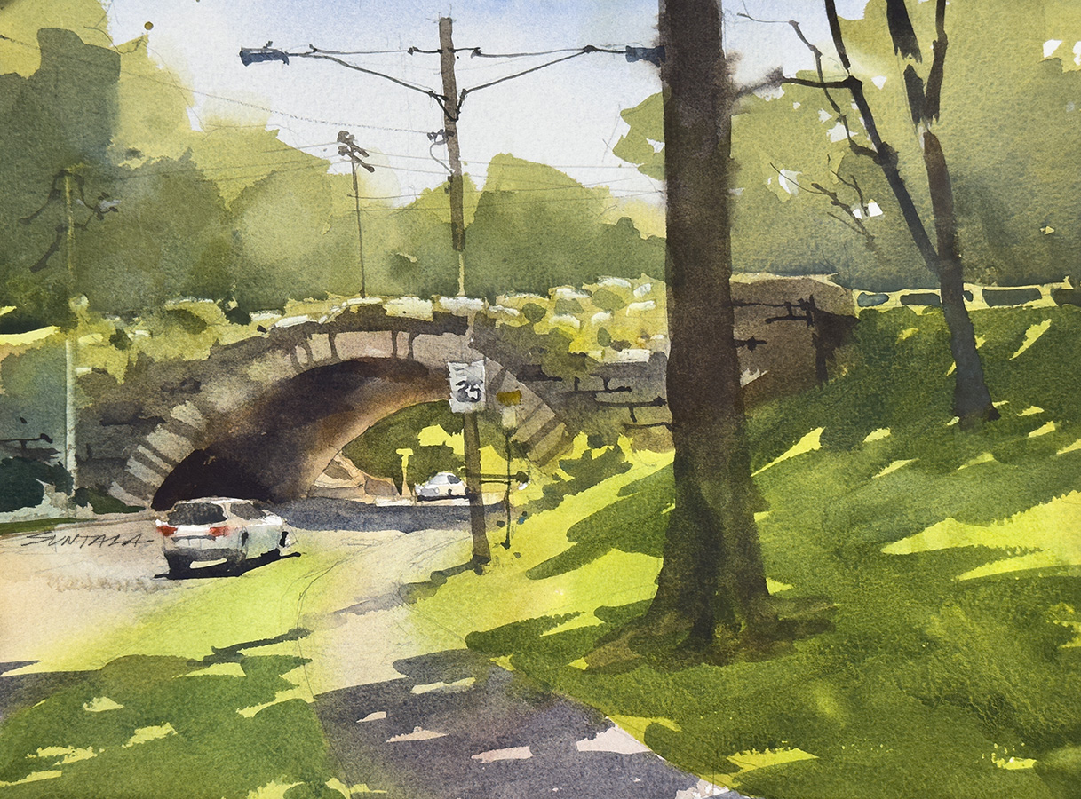 Loose plein air watercolor of the Wade Park Ave Schweinfurth bridge.